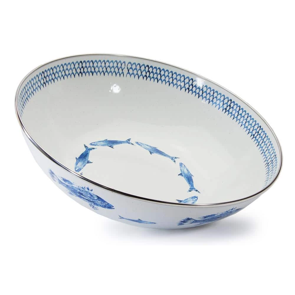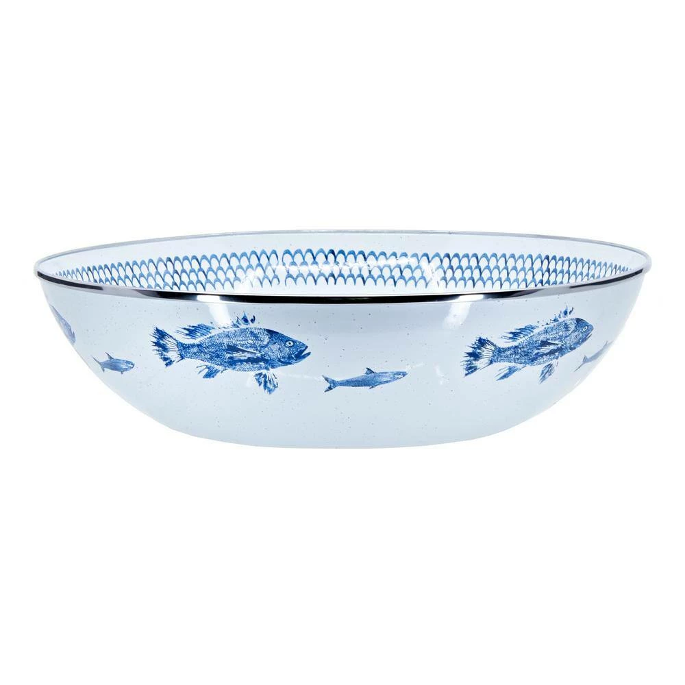 6 quart Catering Bowl, 14 inch diameter x 3.75 inch deep. This enamelware is made of carbon steel coated with a porcelain enamel and trimmed in stainless steel. There will be variations in the shading of colors and pattern formations which are the results of the hand-dipped process. The swirl design is a classic, retro staple for enamelware cookware and serveware. The contrast of colors creates a distinct look and brings a casual artistic flair to your table setting. Each piece is individually hand crafted and is as unique as you are. Skilled artisans hand dip the white background color, then use a brush to hand apply the secondary color swirls. This creates a unique piece and design each time. The elegant and inviting aesthetic draws the eyes into the many spattered patterns flowing throughout. Your piece will be one-of-a-kind and exclusive to you as you create your own distinctive style.