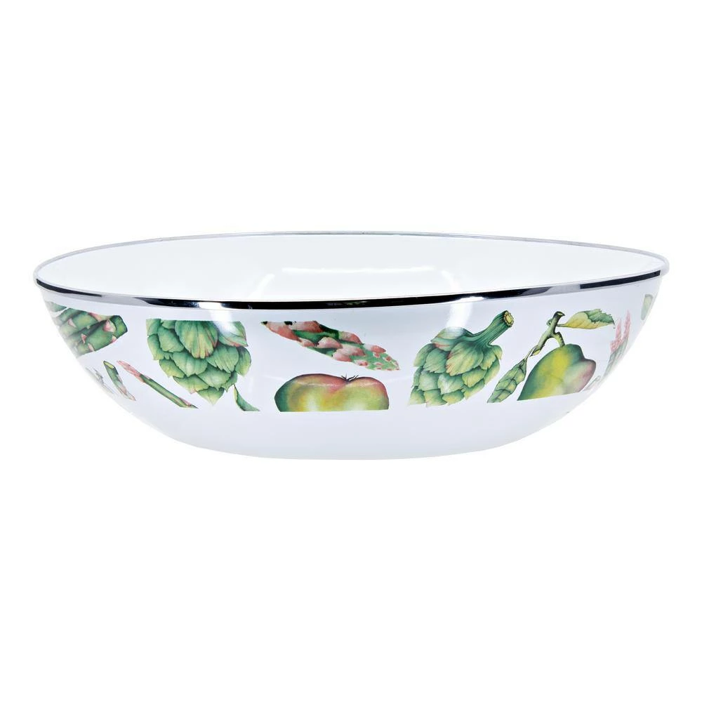 6 quart Catering Bowl, 14 inch diameter x 3.75 inch deep. This enamelware is made of carbon steel coated with a porcelain enamel and trimmed in stainless steel. There will be variations in the shading of colors and pattern formations which are the results of the hand-dipped process. The swirl design is a classic, retro staple for enamelware cookware and serveware. The contrast of colors creates a distinct look and brings a casual artistic flair to your table setting. Each piece is individually hand crafted and is as unique as you are. Skilled artisans hand dip the white background color, then use a brush to hand apply the secondary color swirls. This creates a unique piece and design each time. The elegant and inviting aesthetic draws the eyes into the many spattered patterns flowing throughout. Your piece will be one-of-a-kind and exclusive to you as you create your own distinctive style.