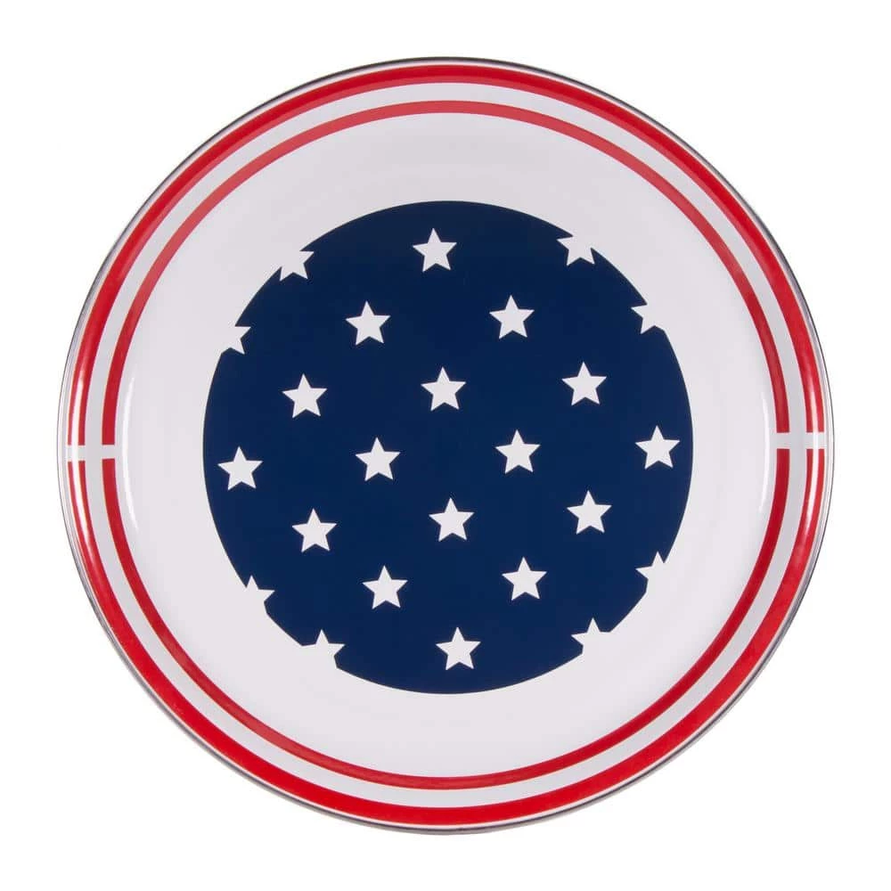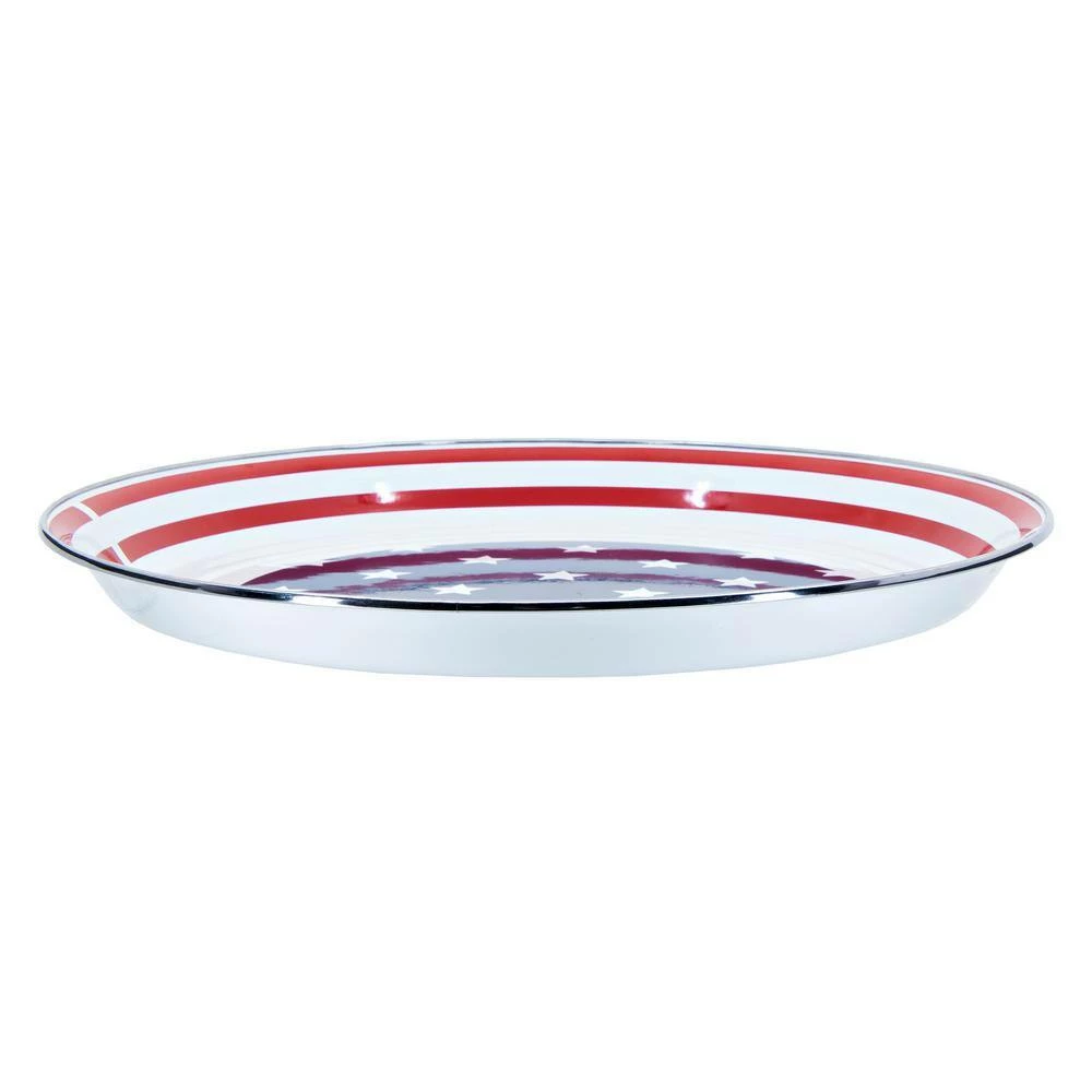 15.5 in. Medium Tray, 1.5 in. deep. This enamelware is made of carbon steel coated with a porcelain enamel and trimmed in stainless steel. There will be variations in the shading of colors and pattern formations which are the results of the hand-dipped process.