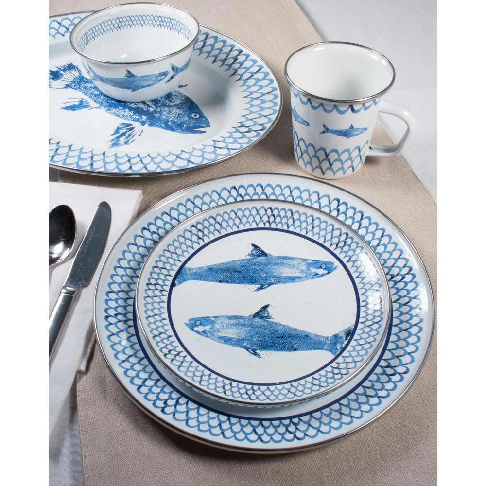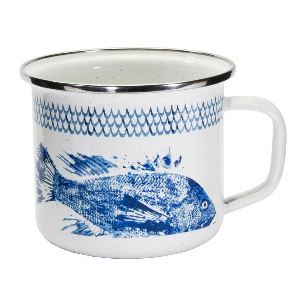 24 oz. Grande Mug, 3.75 in. tall (Set of 4). This enamelware is made of carbon steel coated with a porcelain enamel and trimmed in stainless steel. There will be variations in the shading of colors and pattern formations which are the results of the hand-dipped process.