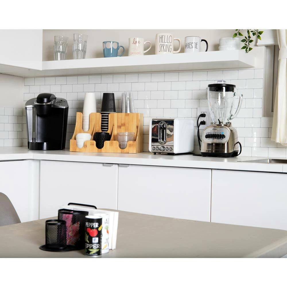 Tidy up the break room with a Mind Reader multi-section condiment organizer. Save space and contain clutter in the break room, hospitality area, coffee station, and anywhere else you need to organize with a Mind Reader multi-level condiment station. Designed to perfectly fit condiments, utensils, draws,-Cups, and lids in a variety of sizes, this organizer can hold a variety of items in its various, easily accessible sections. Use it to stack and sort your-Cups, lids, and serving essentials anywhere where beverages are being served. This condiment organizer is constructed from durable, lightweight bamboo, making it easy to move around as needed, while resisting mold, bacteria, and warping. It grips your countertop or table to prevent it from sliding or skidding, even if there’s a spill. The natural design fits in seamlessly with most decor, making this ideal for use wherever you need it: office break rooms, coffee stations, hotel lobbies, breakfast areas, waiting rooms, dorm rooms, and so much more. When you’re done, simply wipe it down with a damp cloth and appropriate cleaning solution, and it’s ready for re-use. Clean up coffee time with a multi-row supply organizer from Mind Reader Products.