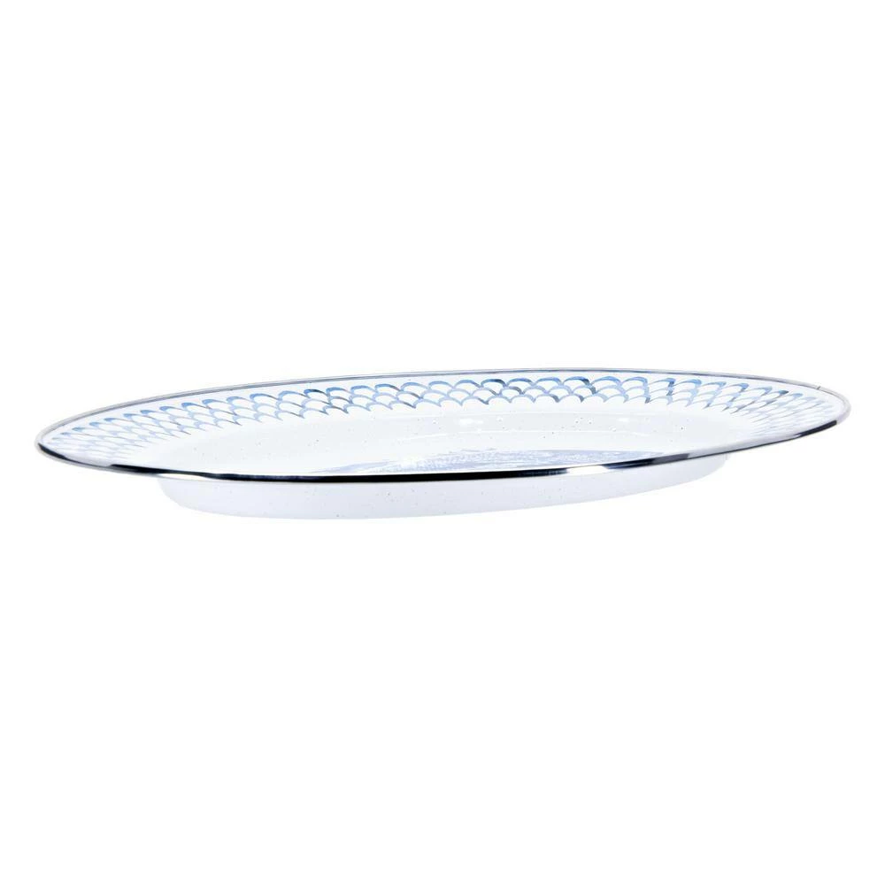 12 in. x 16 in. Oval Platter. This enamelware is made of carbon steel coated with a porcelain enamel and trimmed in stainless steel. There will be variations in the shading of colors and pattern formations which are the results of the hand-dipped process.