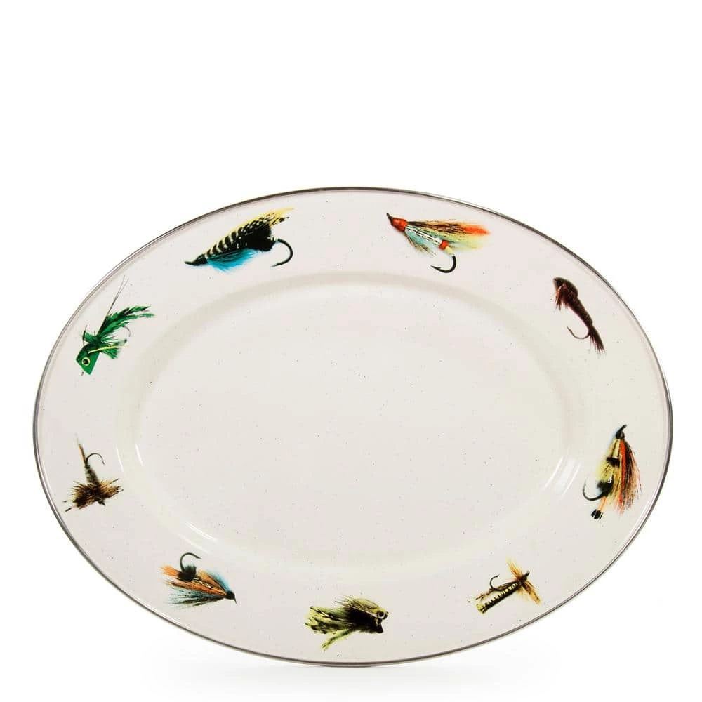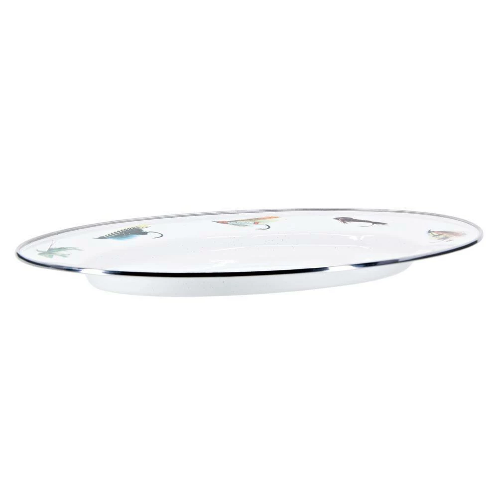 12 in. x 16 in. Oval Platter. This enamelware is made of carbon steel coated with a porcelain enamel and trimmed in stainless steel. There will be variations in the shading of colors and pattern formations which are the results of the hand-dipped process.