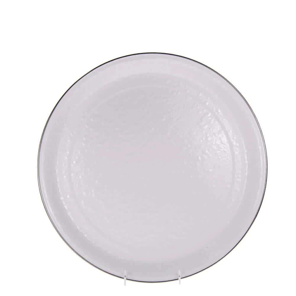 15.5 inch Medium Tray, 1.5 inch deep. This enamelware is made of carbon steel coated with a porcelain enamel and trimmed in stainless steel. There will be variations in the shading of colors and pattern formations which are the results of the hand-dipped process. The swirl design is a classic, retro staple for enamelware cookware and serveware. The contrast of colors creates a distinct look and brings a casual artistic flair to your table setting. Each piece is individually hand crafted and is as unique as you are. Skilled artisans hand dip the white background color, then use a brush to hand apply the secondary color swirls. This creates a unique piece and design each time. The elegant and inviting aesthetic draws the eyes into the many spattered patterns flowing throughout. Your piece will be one-of-a-kind and exclusive to you as you create your own distinctive style.