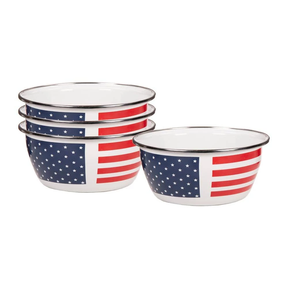 S/4 3-cup salad bowl, 5.5 in. W x 2.5 in. D. This enamelware is made of carbon steel coated with a porcelain enamel and trimmed in stainless steel. There will be variations in the shading of colors and pattern formations which are the results of the hand-dipped process.